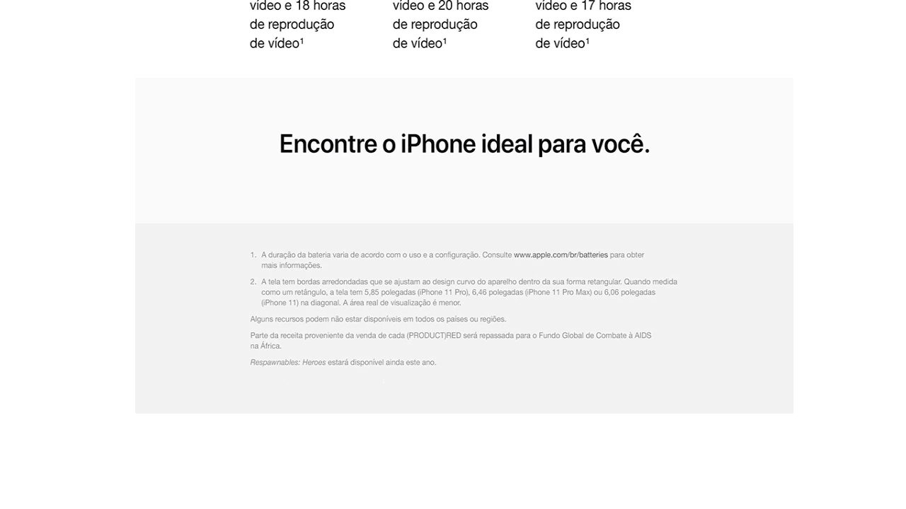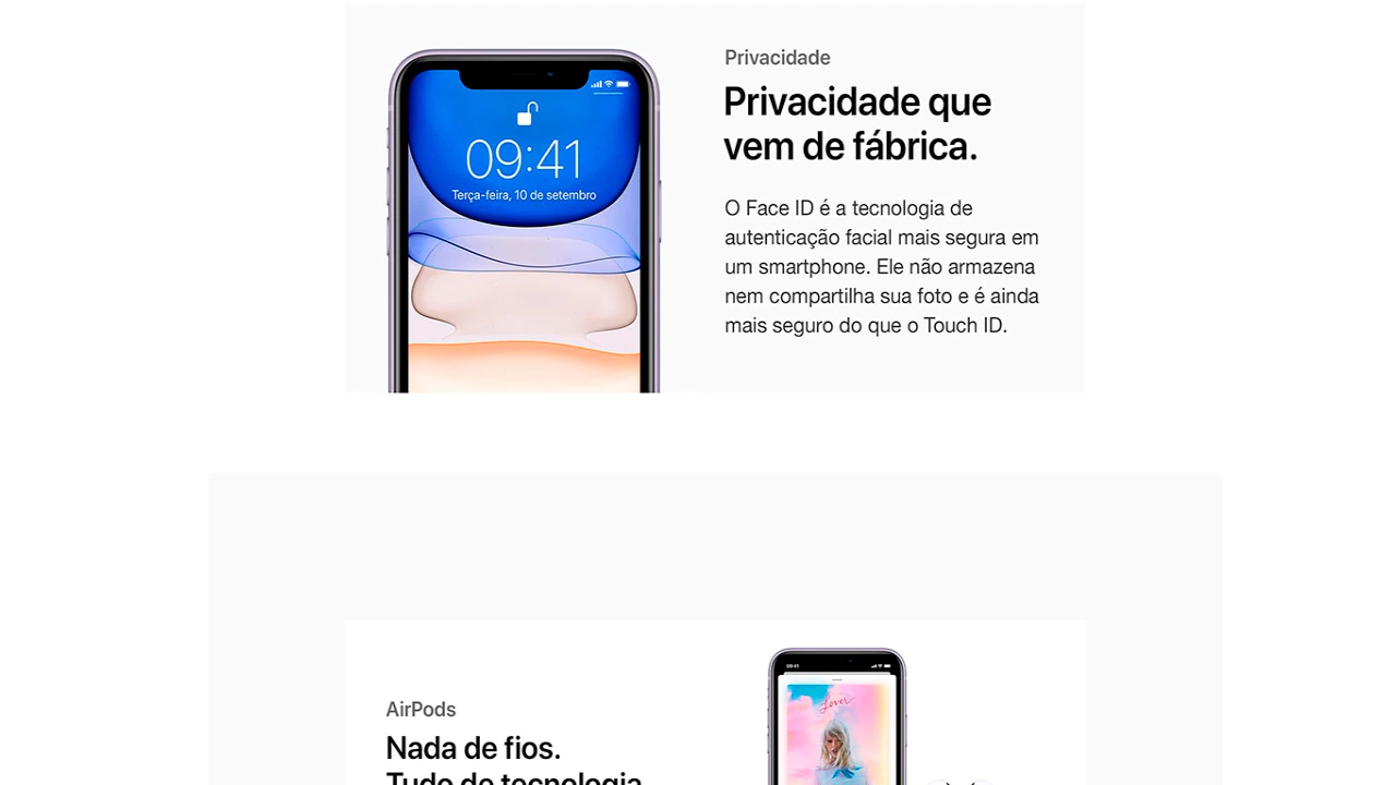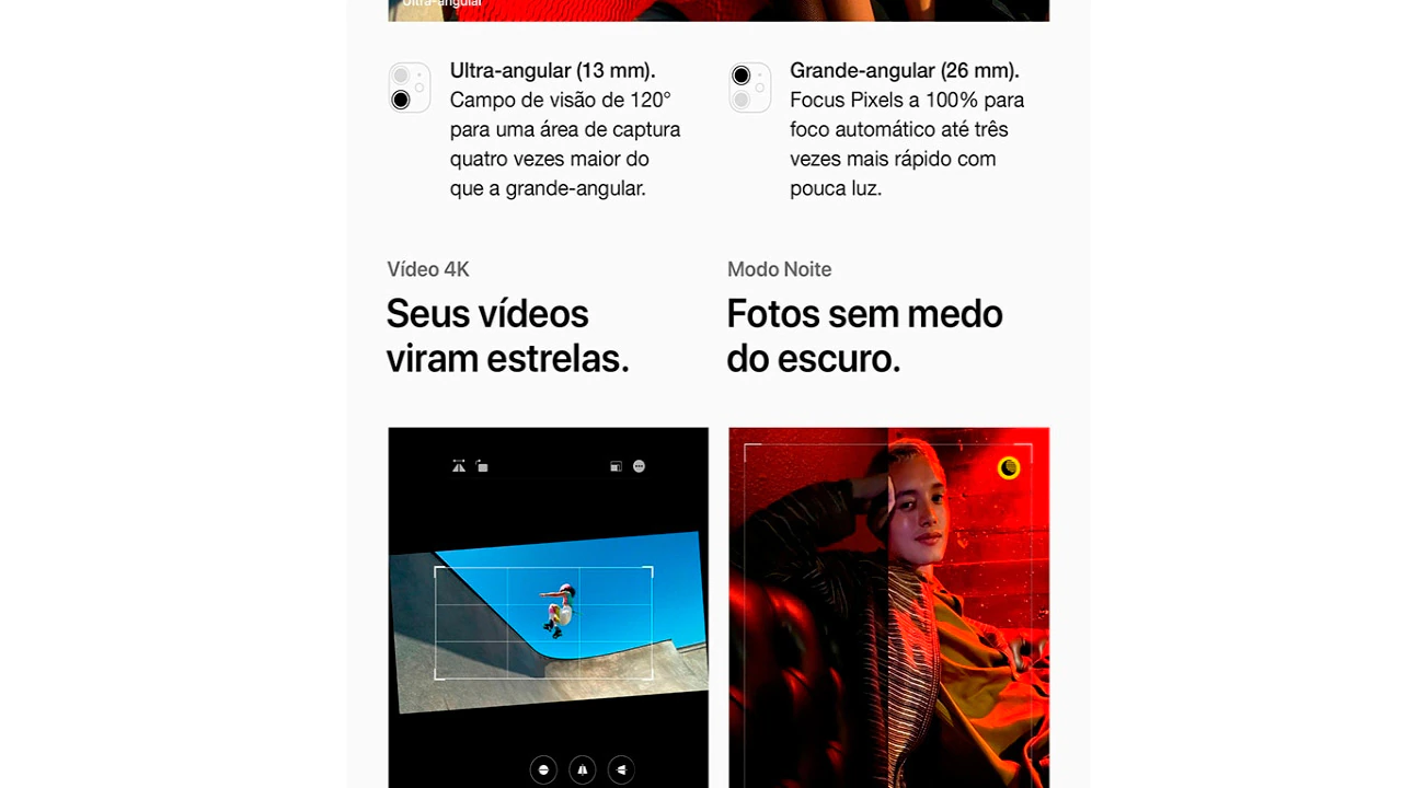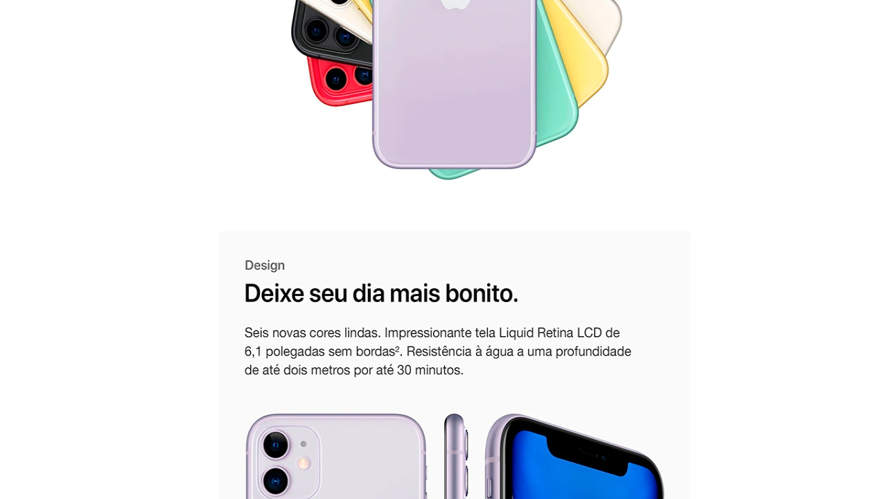 Grave vídeos 4K, faça belos retratos e capture paisagens inteiras com o novo sistema de câmera dupla. Tire fotos incríveis com pouca luz usando o modo Noite. Veja cores fiéis em fotos, vídeos e jogos na tela Liquid Retina de 6.1 polegadas***. Leve o desempenho sem precedentes do chip A13 Bionic para seus games, realidade aumentada e fotografia. Faça muito e recarregue pouco com a bateria para o dia todo**. E conte com resistência à água de até dois metros por até 30 minutos*.